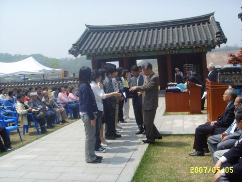 대종회 원찬회장님께서 장학금 을수여하시고 종기부회장님에 참배예절교육을 받고장학생 과 학부모 모두추원사에 참배를 하였으며 다시 중시조 묘소로 올라가서 참배후 주변 청소를 하며 선조님에 대하여 다시생각하는 시간을 가졌고 이어서 점심식사후 원명교수님에 특강으로 용인이문에 보학으로 선조님에 업적에 대하여 설명하여주셨다 원찬회장님께서 교육을 받은 장학생 모두에게